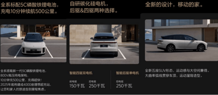 動力方面,理想i6基于800V高壓純電架構打造,配備自研碳化硅電機,其中四驅版前電機功率150千瓦,后電機功率250千瓦;后驅單電機最大功率為250千瓦。
