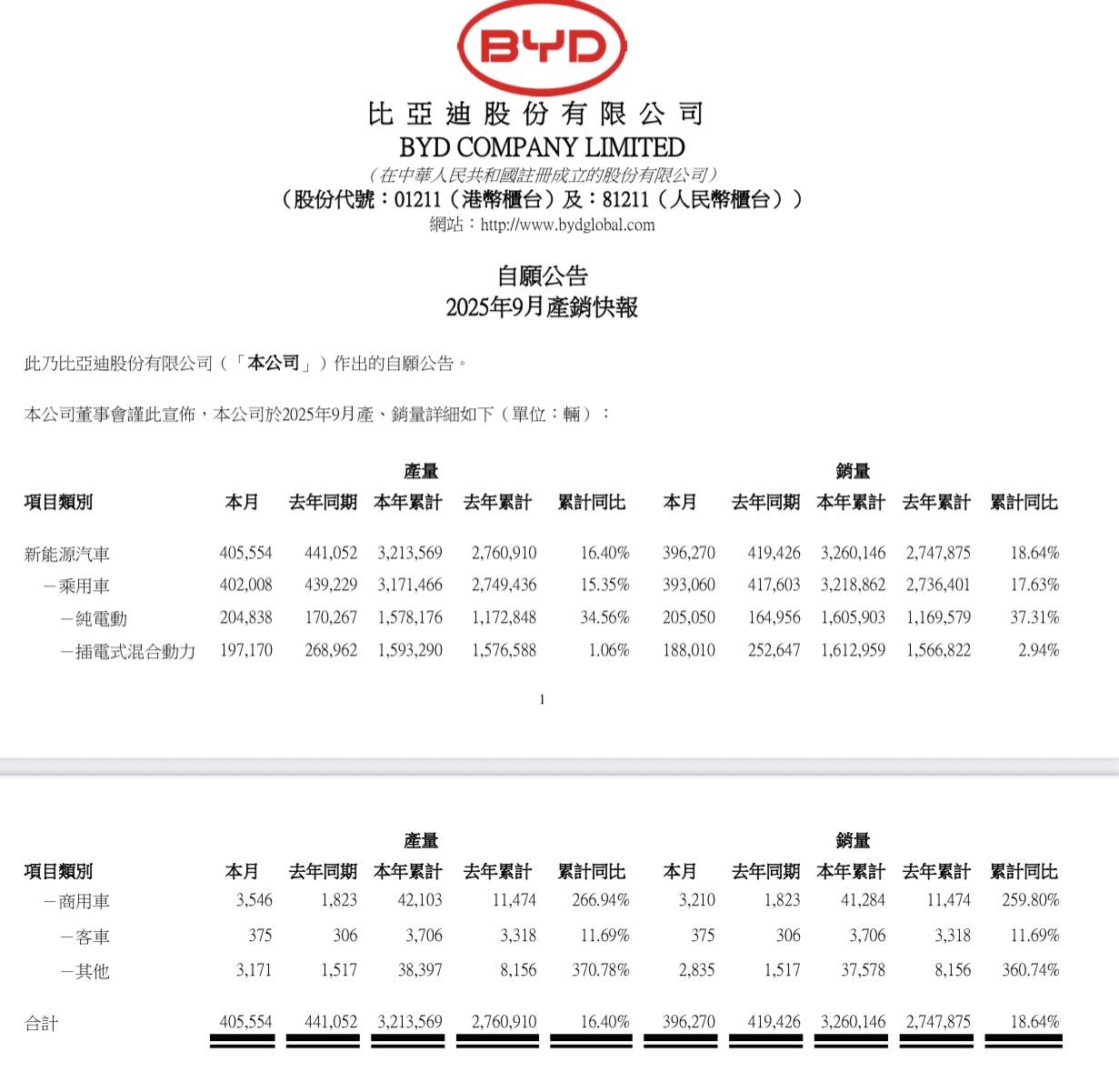 數據顯示,比亞迪9月新能源汽車銷量為39.63萬輛,去年同期為41.94萬輛;1-9月累計銷量為326.01萬輛,同比增長18.64%。
