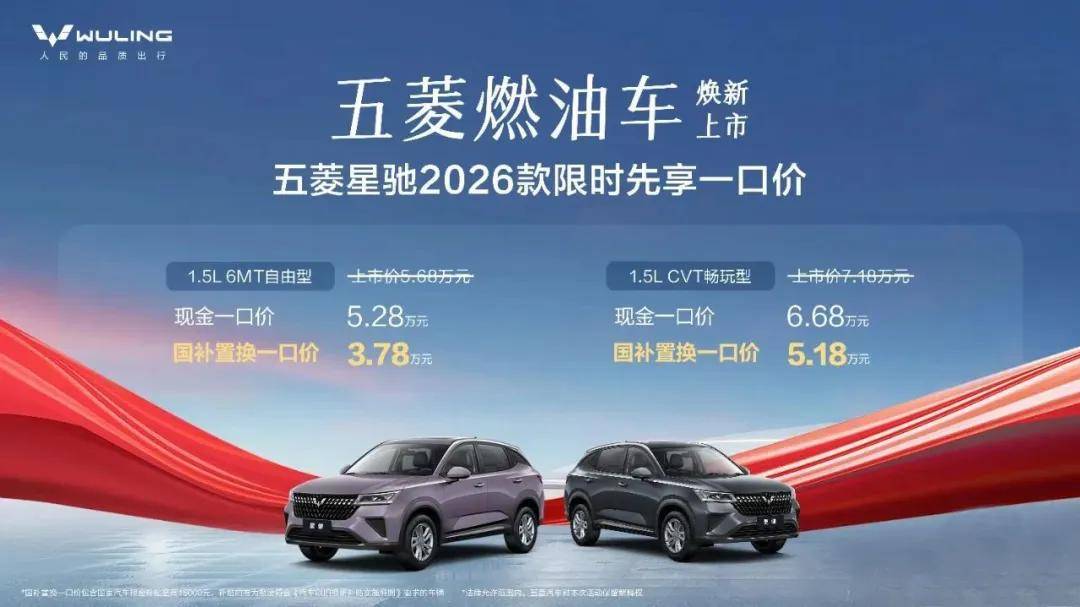 7月22日,2026款五菱星馳正式上市,新車共推出兩個配置并采用限時一口價政策,其中1.5L 6MT自由型現金一口價5.28萬元;1.5L CVT暢玩型現金一口價6.68萬元。