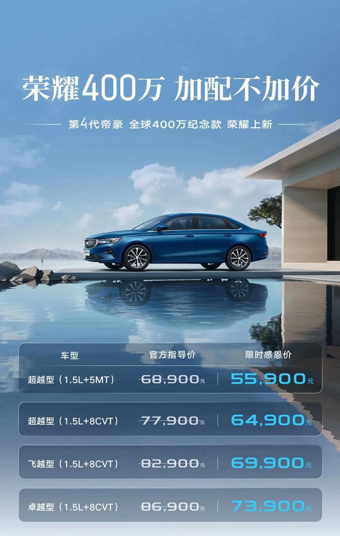 除了SUV之外,還有許多消費者想要購買入門級的轎車,7月9日,吉利帝豪400萬紀念款正式上市,新車共推出4個車型版本,限時感恩價5.59-7.39萬元。