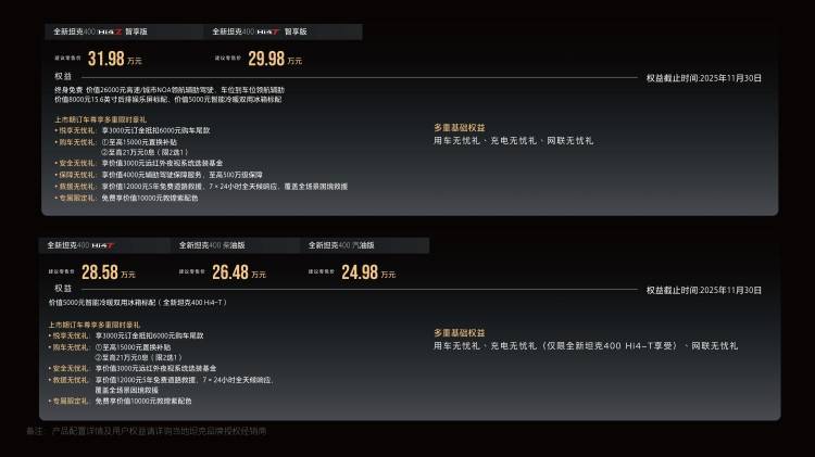 此次全新400構建了覆蓋汽油、柴油、超級電混的全動力產品矩陣,精準匹配不同用戶的使用需求,售價區間24.98萬元-31.98萬元,其中汽油版24.98萬元、柴油版26.48萬元;Hi4-T版28.58萬元;Hi4-T智享版29.98萬元;Hi4-Z智享版31.98萬元。發布會當日,長城汽車董事長魏建軍向AG超玩會夢淚完成新車交付,實現“上市即交付”的服務承諾。