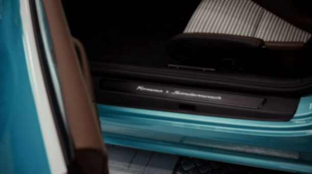 該圖案應用于座椅嵌入層和全真皮包裹的前備箱,同時刺繡有“Formosa”字樣。發光車門迎賓踏板印有“Formosa x Sonderwunsch”標識,頭枕處則壓印著911 Carrera T的輪廓剪影,與海浪及山脈圖騰相互交織。