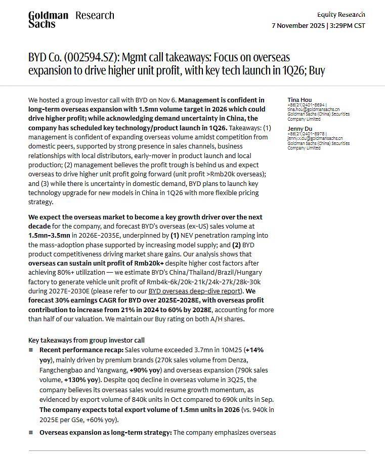 高盛在11月7日的研報中明確指出:海外市場將成為比亞迪未來十年的核心增長領域,依托完善的車型矩陣與強大的產品力,比亞迪2025年至2028年盈利年均復合增長率將達30%,海外利潤貢獻度將從2024年的21%升至2028年的60%,2026至2035年海外銷量有望達150萬至350萬輛,為此高盛堅定維持其A股、H股“買入”評級,A股目標價144元人民幣,相較于12月9日收盤價仍有約50%上漲空間,體現出其對于比亞迪未來市場價值的高度認同。