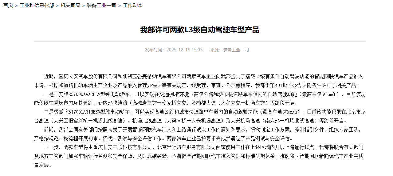 2025年9月,工信部等多部門聯合印發《汽車行業穩增長工作方案(2025—2026年)》,明確提出推進智能網聯汽車準入和上路通行試點,有條件批準L3級車型生產準入。