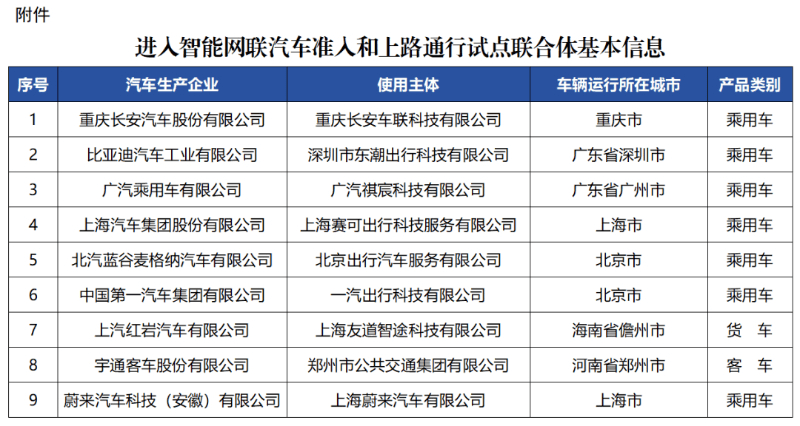 2024年6月,工信部等四部門聯合發布進入首批智能網聯汽車準入和上路通行試點聯合體名單,有包括長安、北汽在內的9個車企。