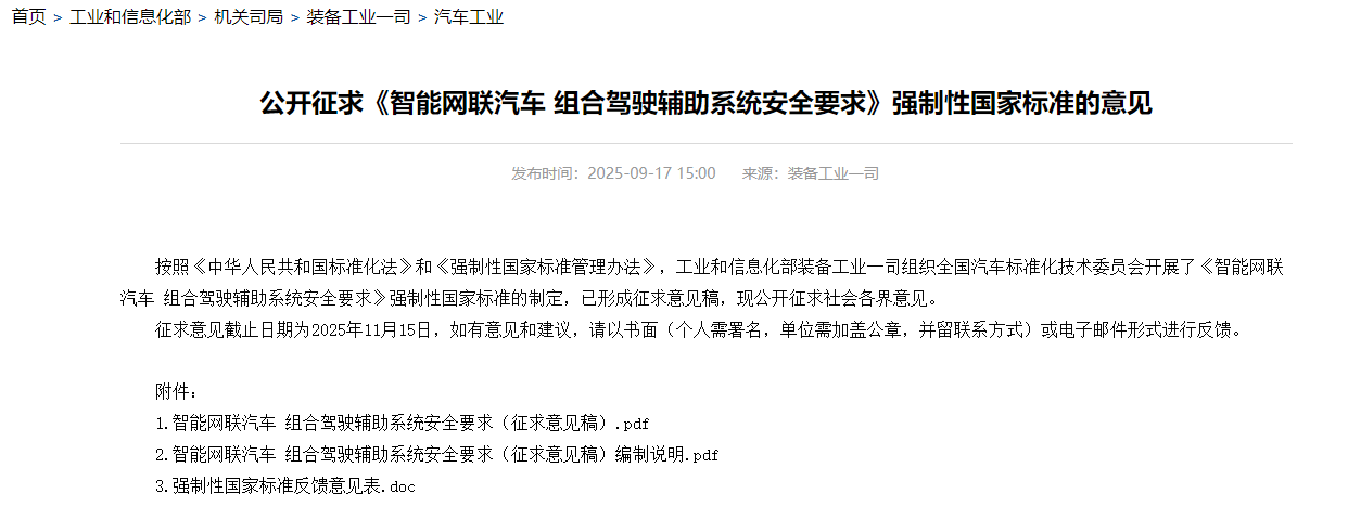 為此,2025年9月,工信部還牽頭發布《智能網聯汽車 組合駕駛輔助系統安全要求》(征求意見稿)強制性國家標準,對此前術語、功能定義等校正糾偏。