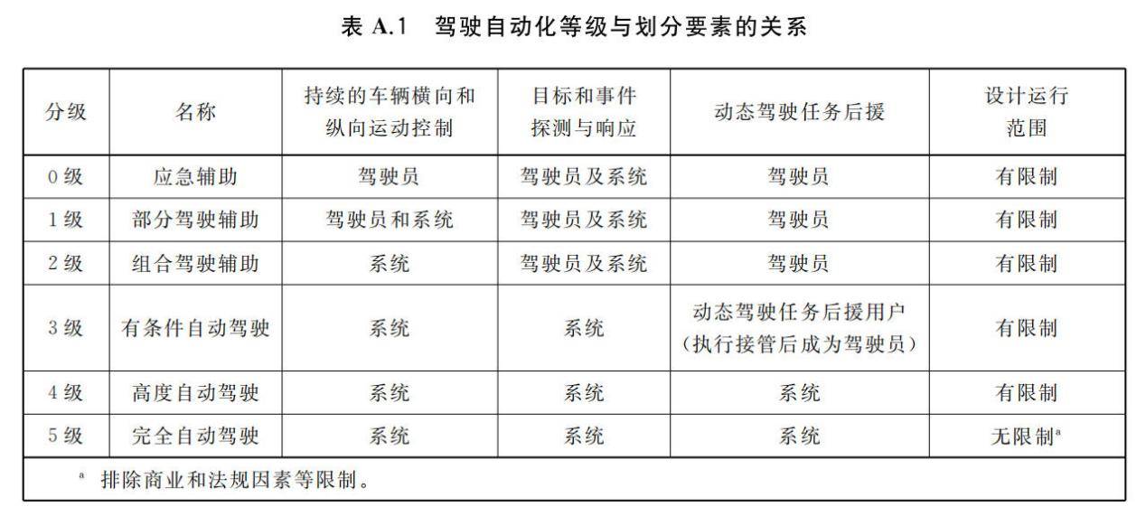 2023年11月18日,工信部發布《關于開展智能網聯汽車準入和上路通行試點工作的通知》,明確參與試點的智能網聯汽車搭載的自動駕駛功能是指國家標準《汽車駕駛自動化分級》(GB/T 40429-2021)定義的3級駕駛自動化(有條件自動駕駛)和4級駕駛自動化(高度自動駕駛)功能。