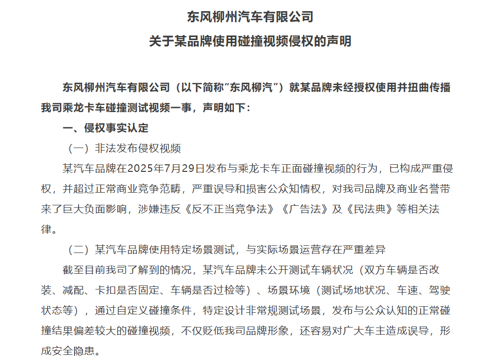 這一畫面顯然不符合大眾的常識,也讓測試本身的專業性與公平性受到質疑。隨后有網友發現,測試所用卡車為東風旗下“乘龍卡車”,并有網友直接“沖進”乘龍卡車社交媒體評論區,質疑該公司產品安全性。很快,該公司也發表聲明表達了不滿。