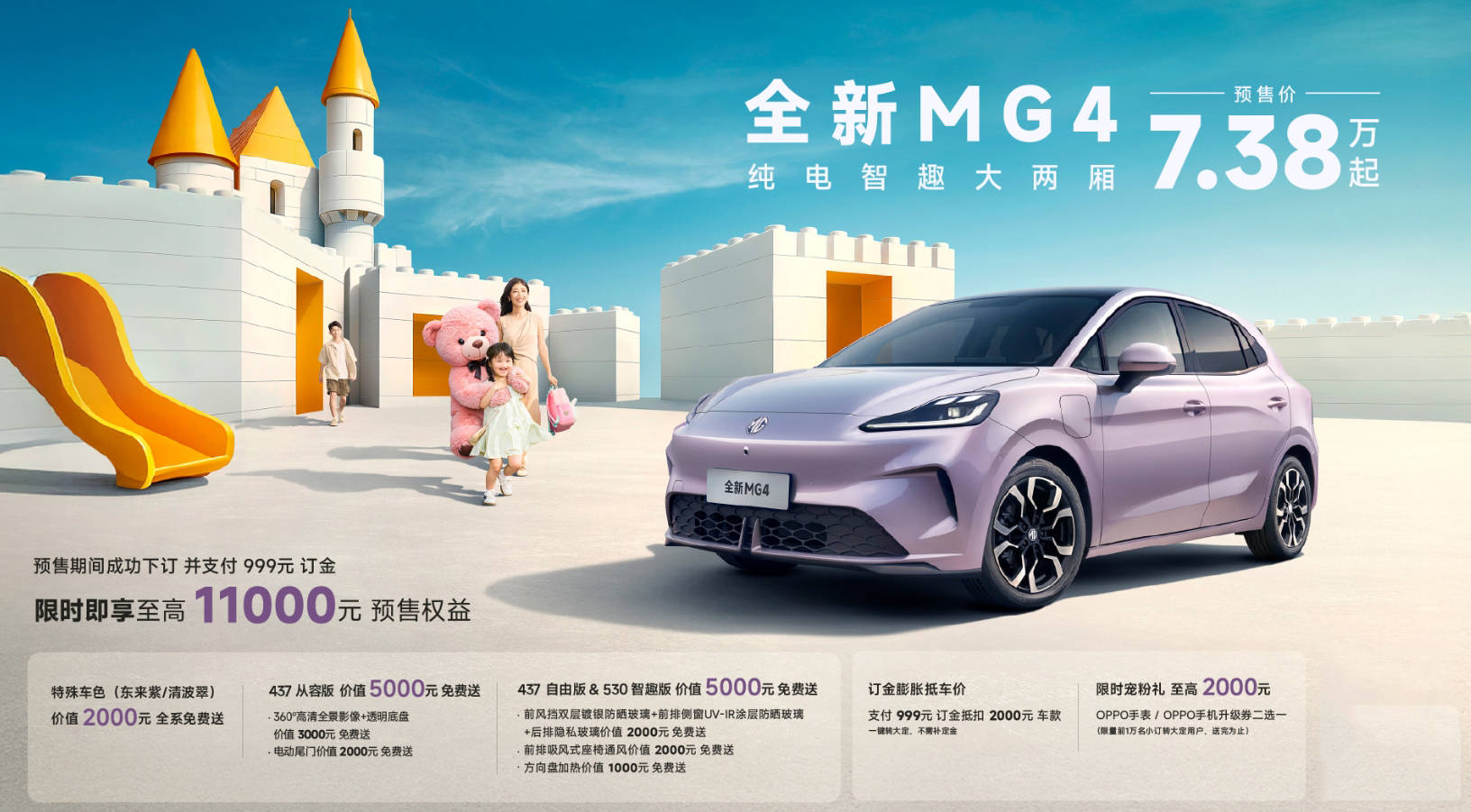 8月5日,全新MG4正式開啟預售,新車共推出4款車型,預售價區(qū)間為7.38-10.58萬元。作為MG全面發(fā)力新能源領(lǐng)域的重磅車型,新車基于上汽E3純電架構(gòu)平臺打造,并且全新MG4率先搭載MG×OPPO智行車機互聯(lián)系統(tǒng)。與此同時,新車還將推出半固態(tài)安芯版本車型,搭載半固態(tài)電池,將于9月公布價格,年內(nèi)批量交付。此外,預售期間成功下訂,并支付999元訂金限時即享至高11000元的預售權(quán)益。