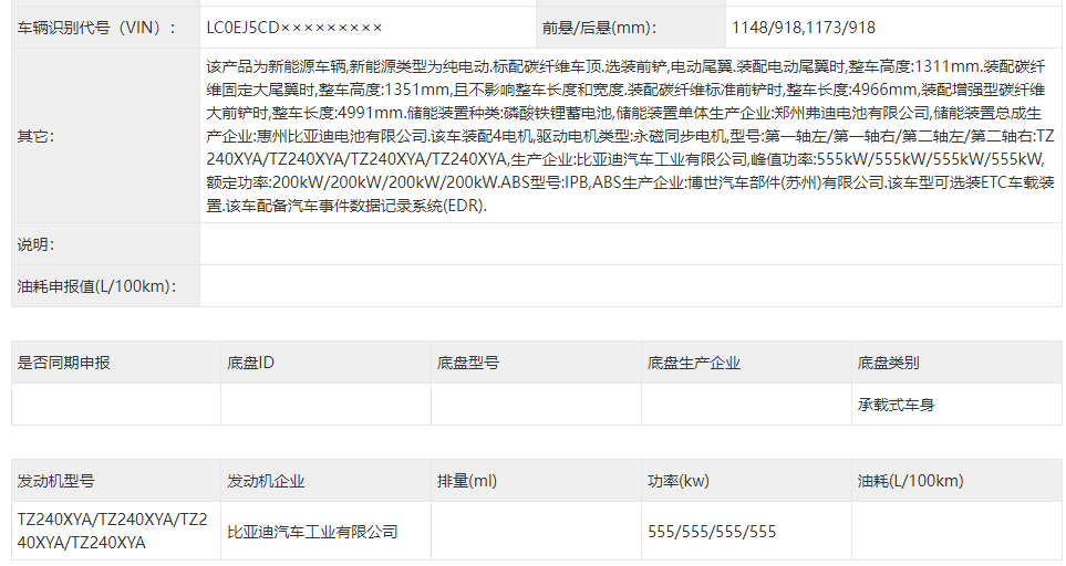 日前,在第398批《道路機動車輛生產企業及產品公告》新產品公示中,仰望U9賽道版申報信息曝光。新車搭載了單個電機555kW的四電機驅動系統,總輸出功率高達2220kW,約為3019馬力,同時,新車還將標配碳纖維車頂和碳纖維固定大尾翼,并且可以選裝電動尾翼。