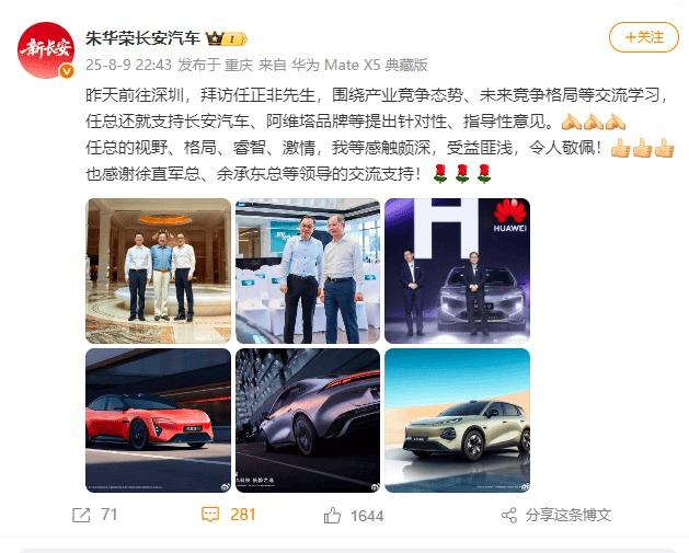 再到新長安成立后一周左右時間,朱華榮拜訪任正非,并在社交媒體上發文表示:“任總的視野、格局、睿智、激情,我等感觸頗深,受益匪淺,令人敬佩。”