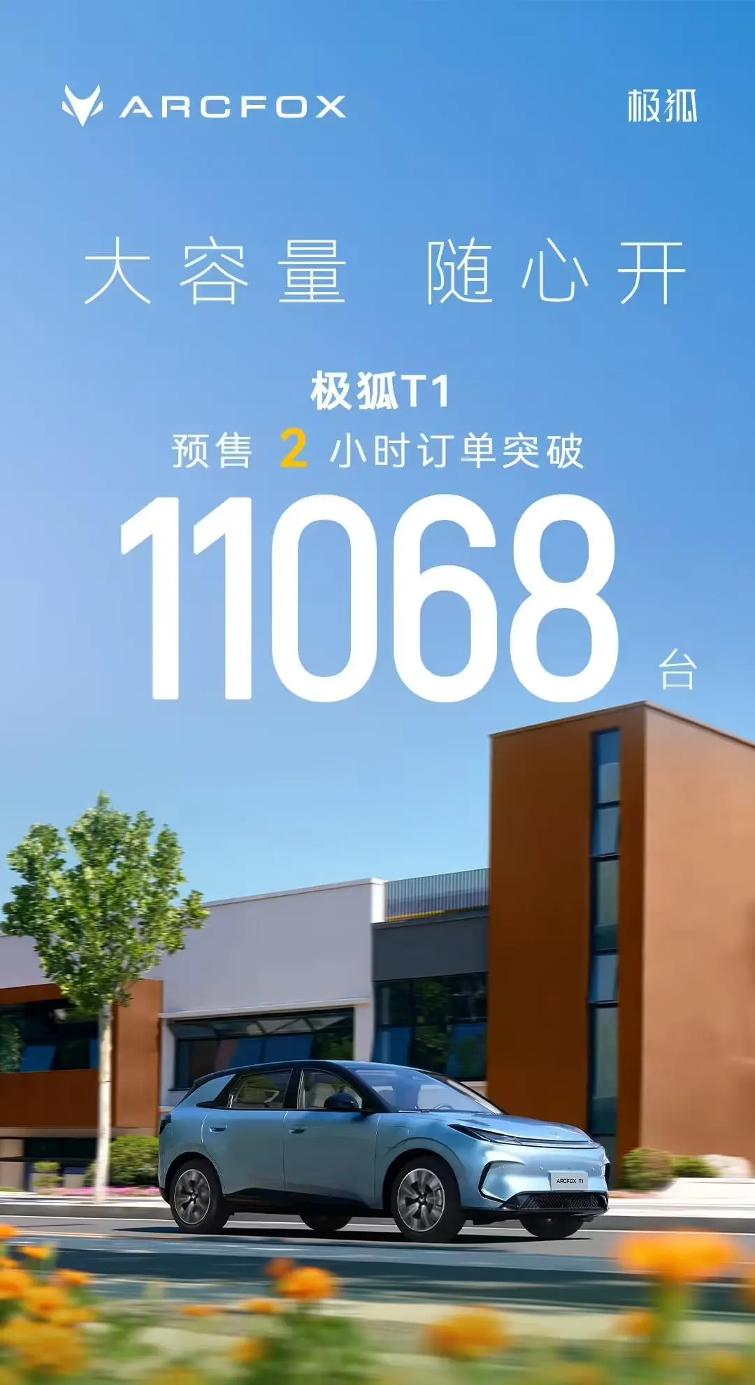8 月 23 日消息,ARCFOX 極狐汽車昨晚宣布,純電小車極狐 T1 預售 2 小時訂單突破 11068 臺。新車預售價為 6.88 萬元起,支付 2000 元定金可享三大預售權益(瓦納藍、草露青、霞光紫三種顏色限免,大容量收納擴展包限免,以及超時交付補償積分)。