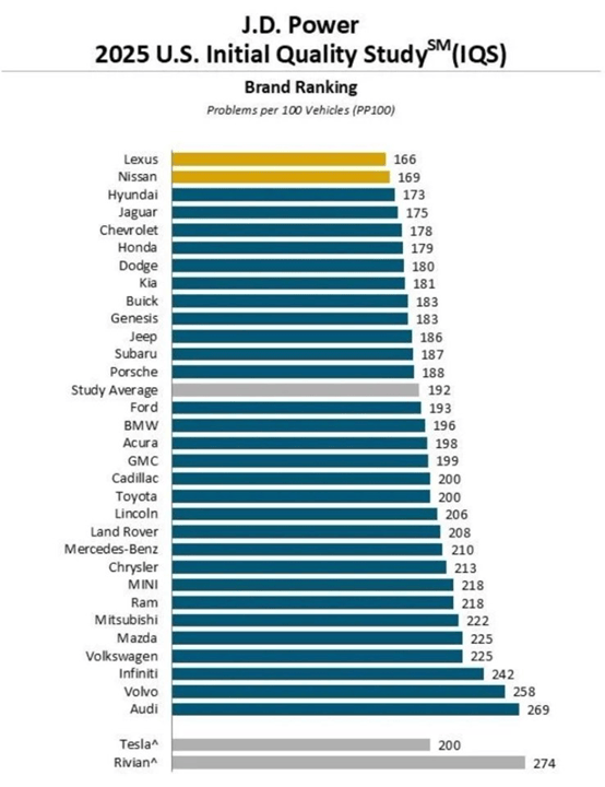 雷克薩斯的逆勢而上,絕非依靠簡單粗暴的價(jià)格戰(zhàn)。其成功的深層密碼,在于對價(jià)值本質(zhì)的長期堅(jiān)守。在業(yè)界權(quán)威的J.D.Power發(fā)布的2025年美國新車質(zhì)量研究(IQS)報(bào)告中,雷克薩斯以最少的用戶問題報(bào)告數(shù),力壓所有豪華及主流品牌,榮登可靠性榜首。這份殊榮并非偶然,而是其數(shù)十年如一日對制造工藝和質(zhì)量管控嚴(yán)苛要求的必然結(jié)果。