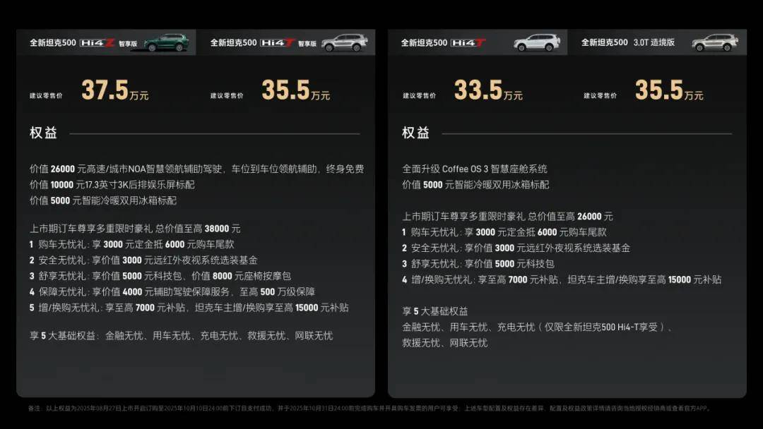 8月27日,全新坦克500正式迎來上市,新車共推出Hi4-Z、Hi4-T及3.0T V6燃油三種動力版本,官方指導(dǎo)價33.5萬-37.5萬元,與目前在售的2023款價格基本持平。