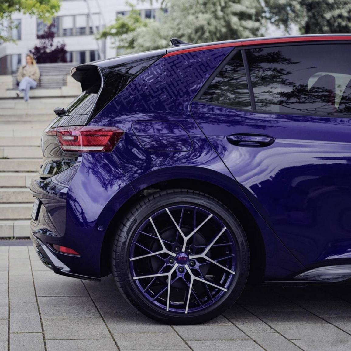 這款車最顯著的視覺特點是專屬的 Ultra Violet Metallic(超紫外金屬漆)涂裝,這是對 1990 年高爾夫 II Fire and Ice 版所采用的深紫色的致敬。車頂框架飾條采用火焰紅陽極氧化處理,營造出運動感的對比效果,C 柱上則以啞光透明貼紙印有 FIRE+ICE 特有的幾何圖案。