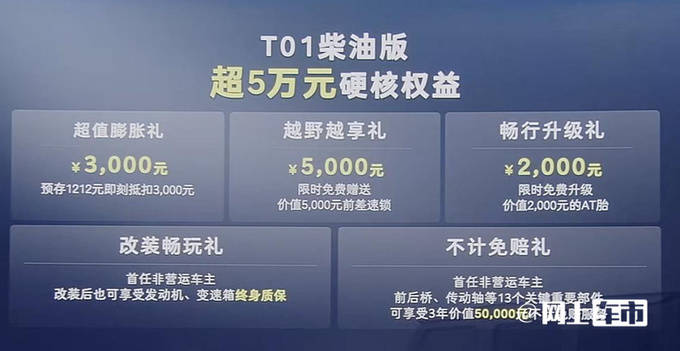 T01柴油版現(xiàn)在是預(yù)售階段,預(yù)存1212元即刻抵扣3000元購車款、限時免費贈送價值5000元的前差速鎖、限時免費升級價值2000元的AT胎、首任非營運車主,可享受發(fā)動機(jī)、變速箱終身質(zhì)保以及首任非營運車主,三年內(nèi)可享受前后橋、傳動軸等13個關(guān)鍵重要部件價值50000元的不計免賠服務(wù)等多個福利。