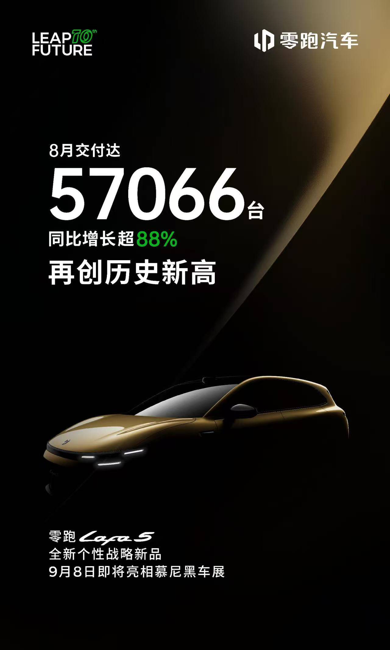 9月1日,零跑汽車公布最新交付數據:8月,零跑汽車全系交付再創新高達57066臺,同比增長超88%,連續六個月穩居新勢力品牌月銷領先位置。